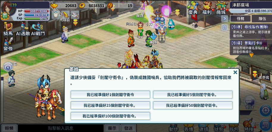 1. 為阻止魏國哨兵取得情報,玩家需前往「涿郡」廣場與潛伏的「姜維」對話,並提交「劍閣守衛令」與「魏國哨兵」戰鬥,擊退他們阻止他們取得情報